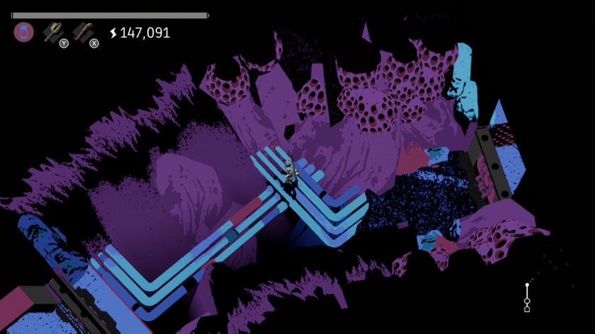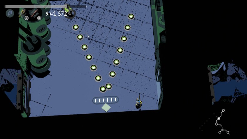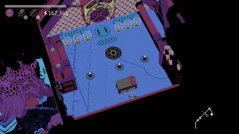 Each room is set up like a miniature pinball machine. There are some rooms that cannot be “completed,” merely existing for you to generate electricity. Then there are the rooms that are mandatory in order to unlock secrets, which will be marked on your map as such – a very appreciated feature if you choose to go back and clear them later, so you can easily find them again. The mandatory rooms consist of all sorts of machines and bumpers that will try to kill you – while clearing these machines (by knocking down all the bumpers with energy balls) is the path to clear each room, if you hit the wrong machines, you’re in for a world of trouble.