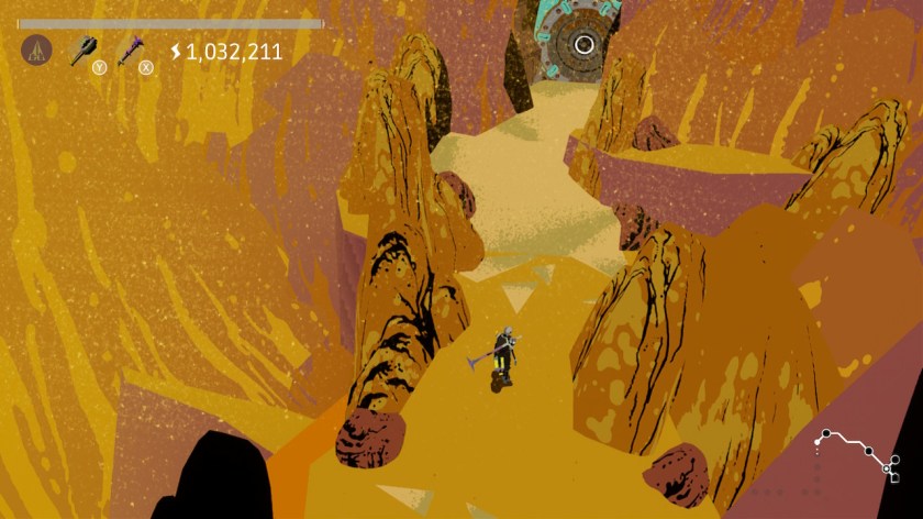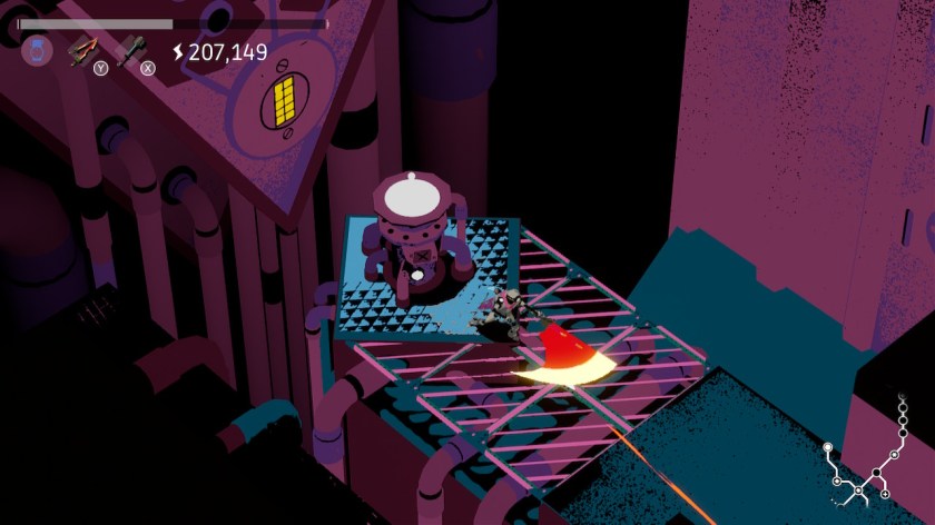 There’s upgrade mechanics as well! You can update your maximum generated electrical charge by collecting hidden Cores, then paying a handsome sum along with the core to Danielle, an alligator who runs a nearby shop in town. This helps you more quickly charge your weapon and increases the damage output you can do with it. In fact, some puzzles will be damn-near impossible without some upgrades. You will also find new Strike and Charge weapons, and some provide improved perks for Bot-C, such as the ability to catch a ball without being pushed back, gaining an aim line to see where your ball will go, or entering slow-motion before striking the ball. You can change out your weapons on the fly, and I found myself jump back and fourth between weapons during some of the boss fights – a word to the wise, definitely experiment with all of the weapons you find, and learn to identify situations where each one excels.